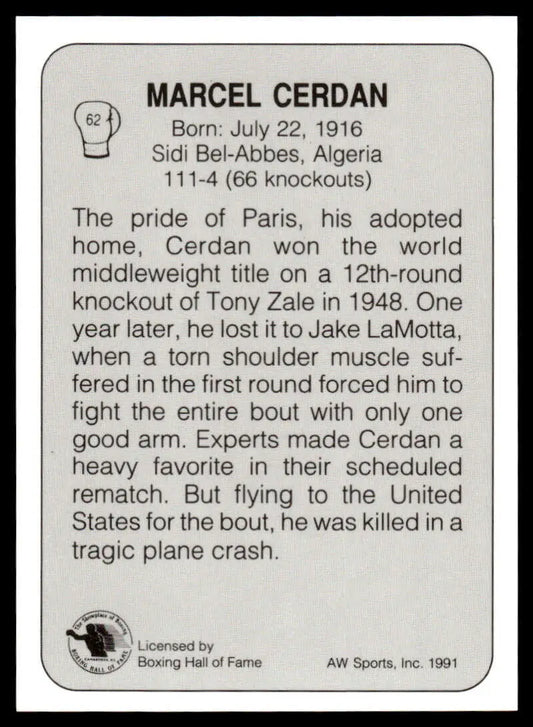 1991 All World #62 Marcel Cerdan NM-MT Boxing Card