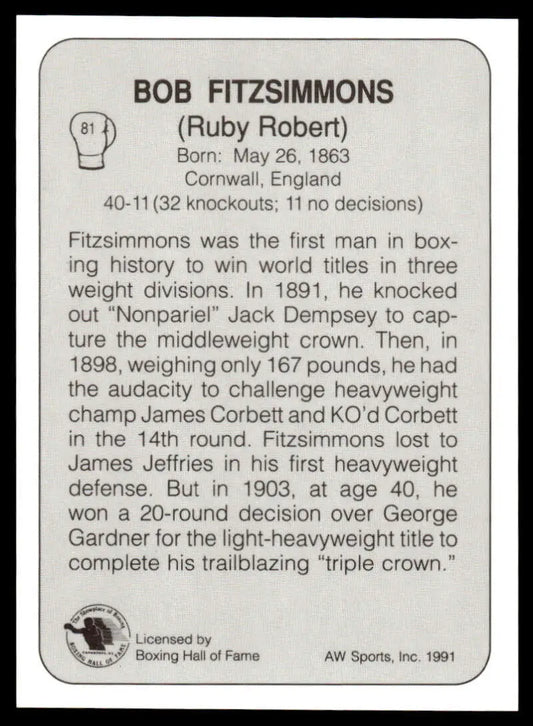 1991 All World #81 Bob Fitzsimmons NM-MT Boxing Card
