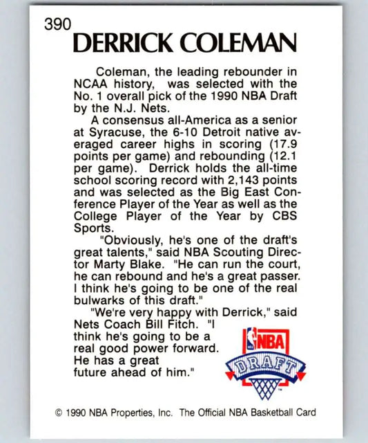 1990-91 Hoops #390 Derrick Coleman NM-MT RC Rookie New Jersey Nets Basketball Card