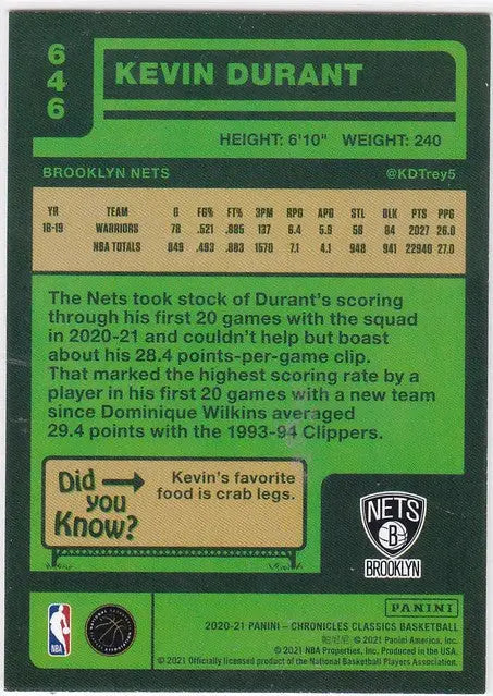 2020-21 Panini Chronicles Classics #646 Kevin Durant Brooklyn Nets