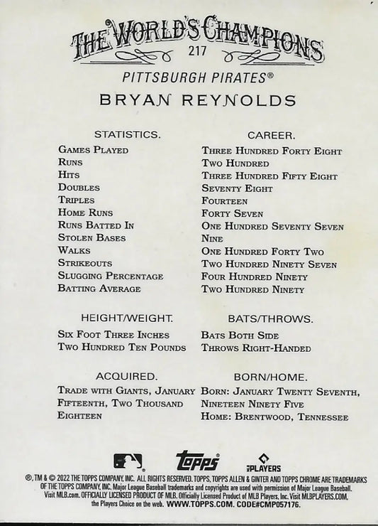 2022 Topps Allen and Ginter Chrome #217 Bryan Reynolds NM-MT Pittsburgh Pirates Baseball Card