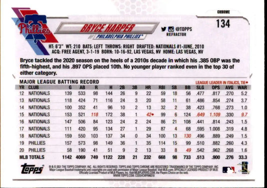 2021 Topps Chrome Refractor #134 Bryce Harper NM/MT Philadelphia Phillies Baseball Card