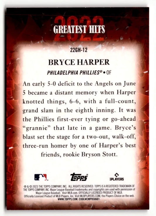 2023 Topps 2022 Greatest Hits #22GH-12 Bryce Harper NM-MT Philadelphia Phillies Baseball Card