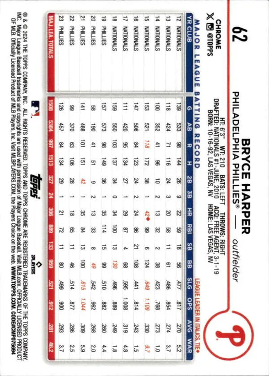 2024 Topps Chrome #62 Bryce Harper NM-MT Philadelphia Phillies Baseball Card
