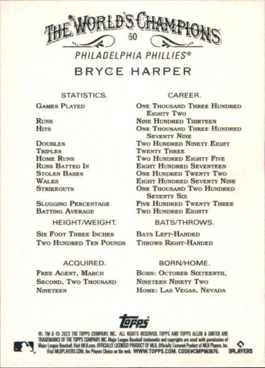 2023 Topps Allen and Ginter #60 Bryce Harper NM-MT Philadelphia Phillies Baseball Card
