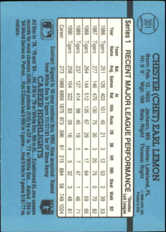 1991 Donruss #301 Chet Lemon NM-MT Detroit Tigers Baseball Card