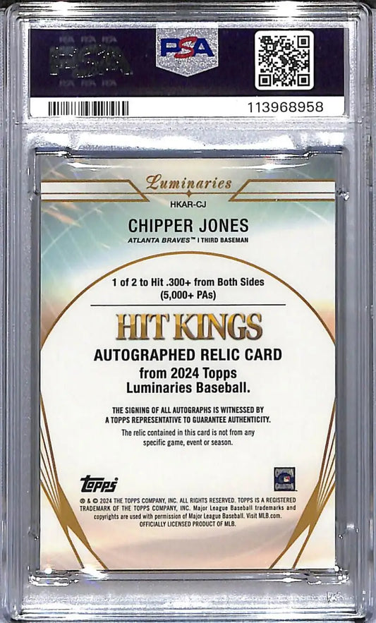 2024 Topps Luminaries Hit Kings #HKAR-CJ Chipper Jones PSA 10 GEM MINT MEM Auto 14/15 Atlanta Braves