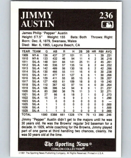 1991 Conlon Collection #236 Jimmy Austin EX Excellent St. Louis Browns Baseball Card