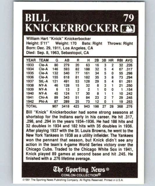 1991 Conlon Collection #79 Bill Knickerbocker EX Excellent St. Louis Browns Baseball Card