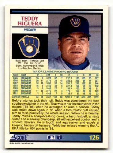 1992 Score #126 Teddy Higuera Milwaukee Brewers Baseball Cards EX/NM ID:60471