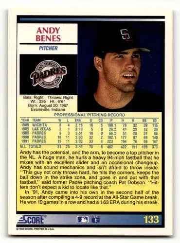 1992 Score #133 Andy Benes San Diego Padres Baseball Cards EX/NM ID:60473