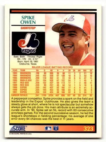 1992 Score #323 Spike Owen Montreal Expos Baseball Cards EX/NM ID:60481