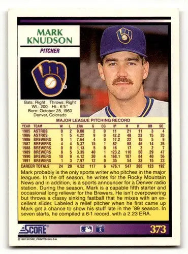 1992 Score #373 Mark Knudson Milwaukee Brewers Baseball Cards EX/NM ID:60482