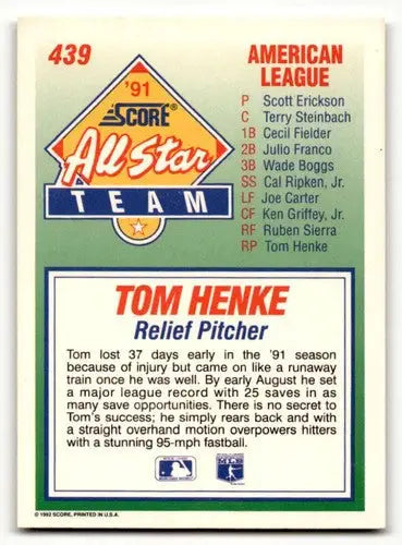 1992 Score #439 Tom Henke Toronto Blue Jays Baseball Cards EX/NM ID:60458