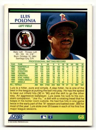 1992 Score #68 Luis Polonia California Angels Baseball Cards EX/NM ID:60467