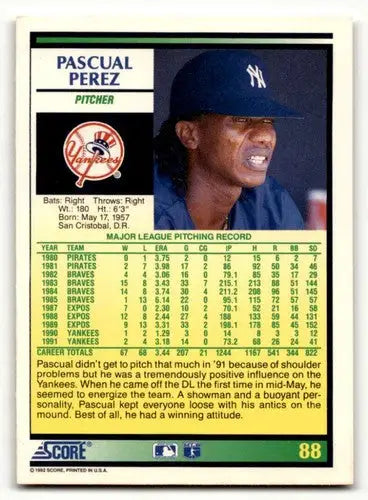 1992 Score #88 Pascual Perez New York Yankees Baseball Cards EX/NM ID:60462