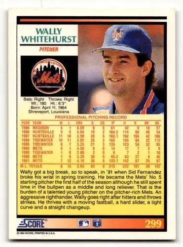 1992 Score #299 Wally Whitehurst New York Mets Baseball Cards EX/NM ID:60478
