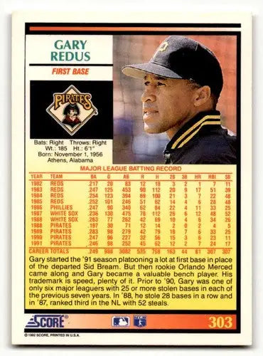 1992 Score #303 Gary Redus Pittsburgh Pirates Baseball Cards EX/NM ID:60456