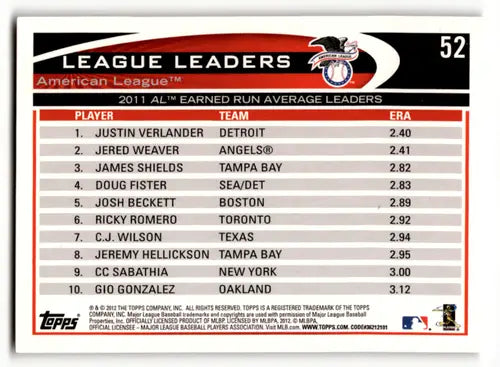 2012 Topps #52 Justin Verlander/Jered Weaver/James Shields EX/NM LL ID:62582