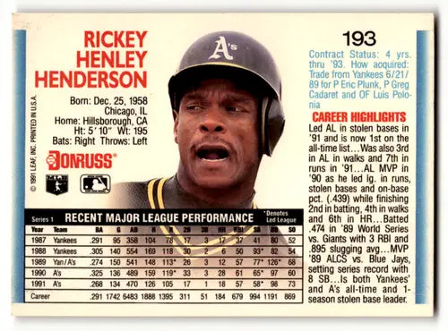 1992 Donruss #193 Rickey Henderson NM Near Mint Athletics ID:63927