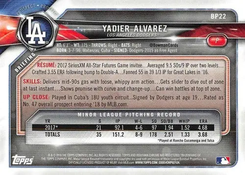 2018 Bowman Prospects #BP22 Yadier Alvarez NM-MT Dodgers