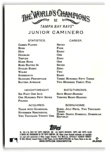 2024 Allen & Ginter #92 Junior Caminero NM-MT RC Rookie Rays ID:74560
