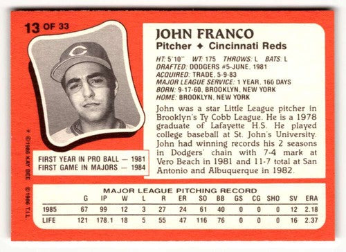 1986 Topps Kay-Bee Young Superstars of Baseball #13 John Franco NrMt-Mt ID:50410