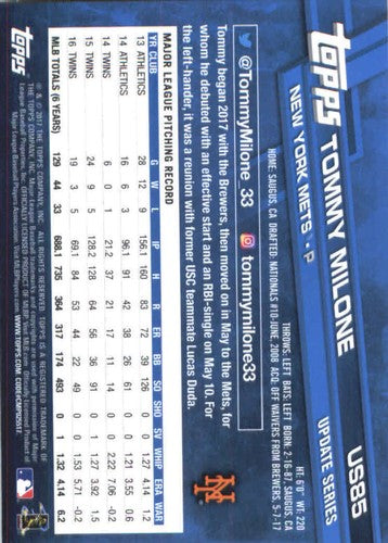 2017 Topps Update #US85 Tommy Milone NM-MT Mets