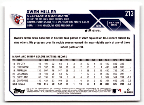 2023 Topps #213 Owen Miller NM Near Mint Guardians ID:49605