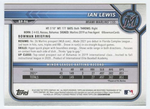 2022 Bowman Prospects #BP-96 Ian Lewis NM-MT Marlins 1st Bowman ID:41993