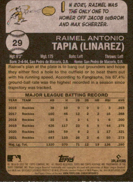 2022 Topps Heritage #29 Raimel Tapia NM-MT Rockies ID:41179