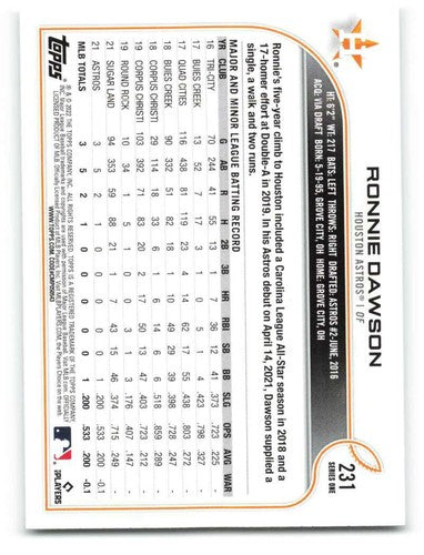 2022 Topps #231 Ronnie Dawson NM-MT RC Rookie Astros ID:41034