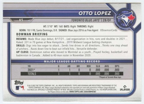 2022 Bowman #65 Otto Lopez NM-MT RC Rookie Blue Jays ID:42035
