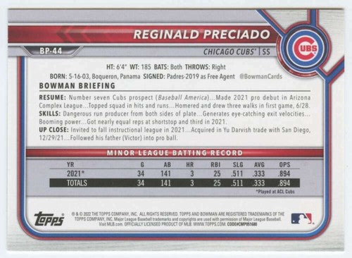 2022 Bowman Prospects #BP-44 Reginald Preciado NM-MT Cubs ID:41982