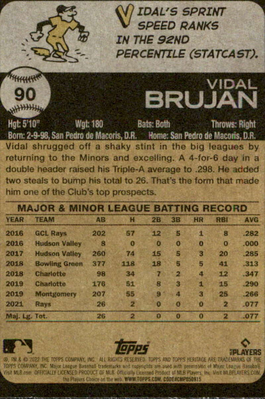 2022 Topps Heritage #90 Vidal Brujan NM-MT Rays ID:41229