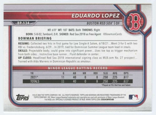2022 Bowman Prospects #BP-134 Eduardo Lopez NM-MT Red Sox 1st Bowman ID:42002