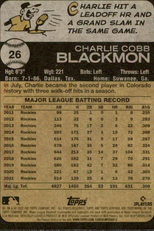 2022 Topps Heritage #26 Charlie Blackmon NM-MT Rockies ID:41173
