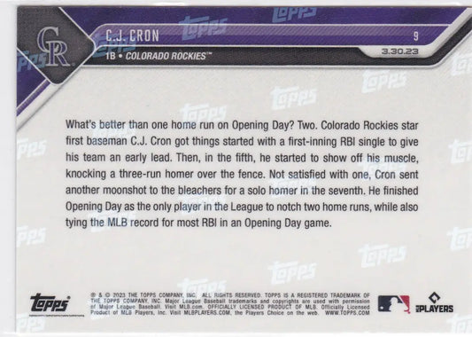 2023 TOPPS NOW #9 CJ CRON- COLORADO ROCKIES