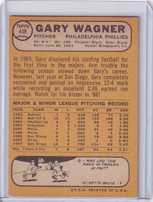 1968 Topps Baseball #448 Gary Wagner - Philadelphia Phillies