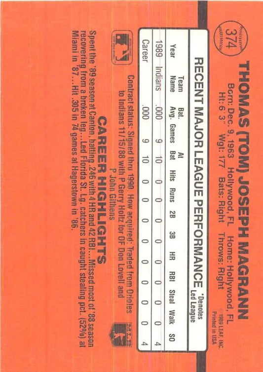 1990 Donruss #374 Tom Magrann VG-EX RC Rookie Cleveland Indians Baseball Card