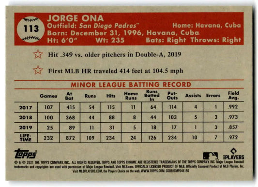 2021 Topps Chrome Platinum Anniversary #113 Jorge Ona NM-MT RC Rookie San Diego Padres Baseball Card
