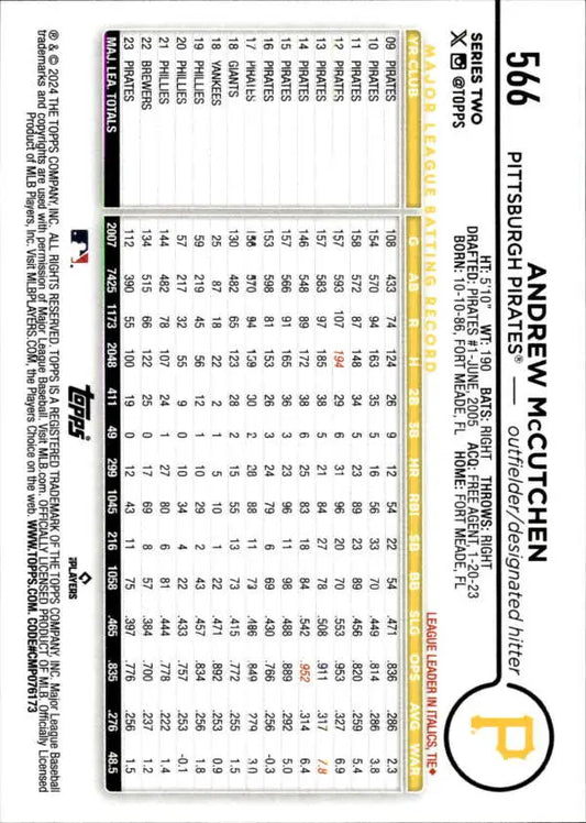 2024 Topps #566 Andrew McCutchen NM-MT Pittsburgh Pirates Baseball Card