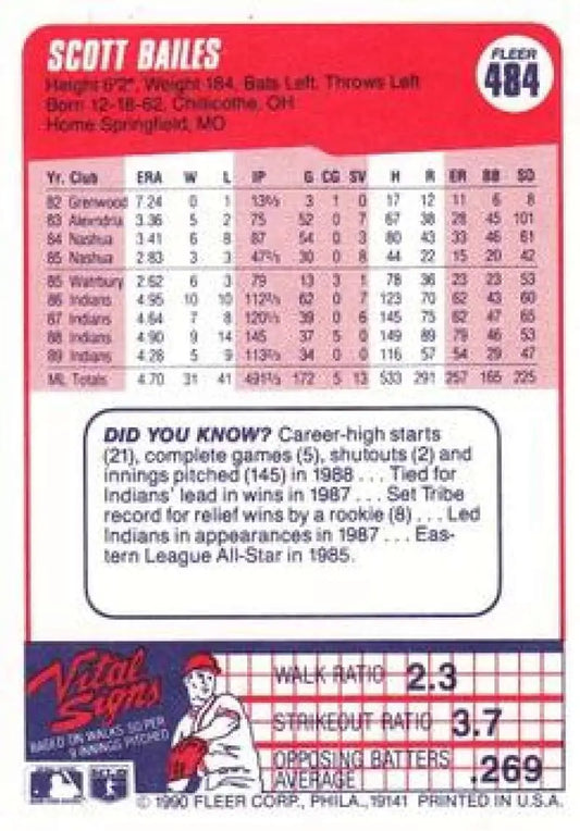 1990 Fleer #484 Scott Bailes NM-MT Cleveland Indians Baseball Card