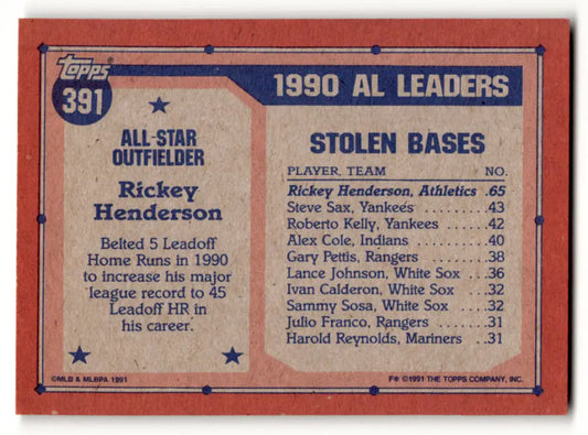1991 Topps #391 Rickey Henderson NM-MT Oakland Athletics Baseball Card