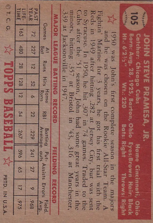 1952 Topps Baseball #105 John Pramesa Chicago Cubs