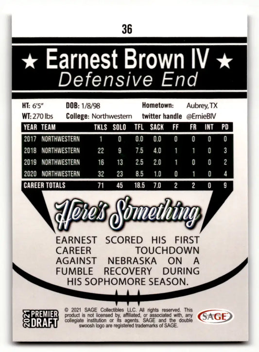 2021 SAGE Hit Premier Draft Red #36 Earnest Brown IV NM Near Mint ID:46781