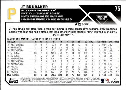 2023 Topps #75 JT Brubaker NM-MT Pirates ID:49757