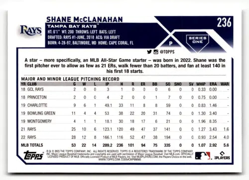 2023 Topps #236 Shane McClanahan NM Near Mint Rays ID:49636