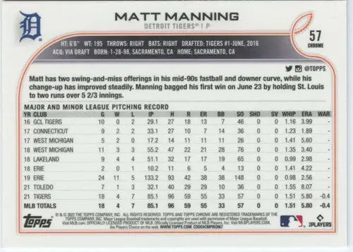 2022 Topps Chrome #57 Matt Manning NM-MT RC Rookie Tigers ID:51625