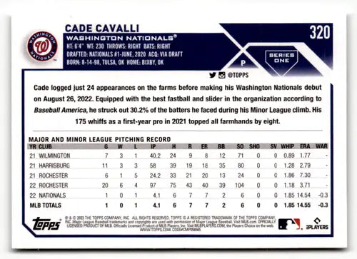 2023 Topps #320 Cade Cavalli NM-MT RC Rookie Nationals ID:49581
